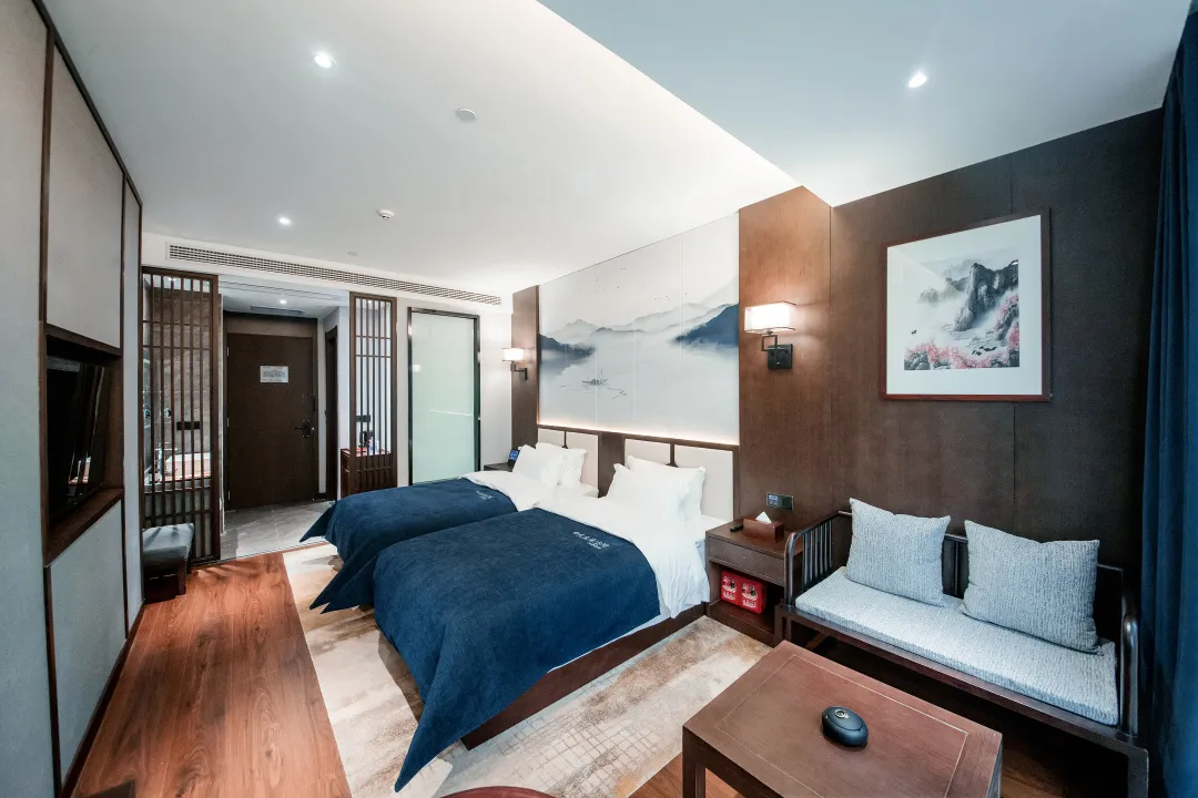 酒店大堂大面积以木质为主,墨白基调静谧清新,盆景逑然而立,种类繁多的古色古香的茶具和艺术插花,透露出古朴内敛的中式韵致,在柔和的灯光渲染下,彰显宽阔大气的空间质感。